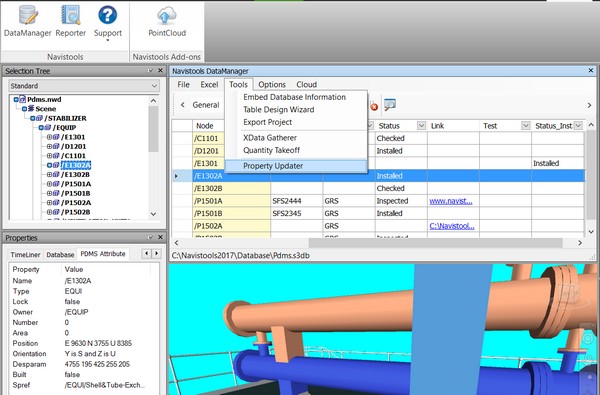 With Property Updater you can copy Navisworks properties to the Navistools database table. Property Updater function can be launched from DataManager à Tools à Property Updater