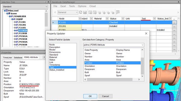 First select column name that you want update from the left listbox (Test in this example). Then select Property Category and Data Property from the listboxes on the right (PDMS Attribute and Position). After that press Ok to start pocess.